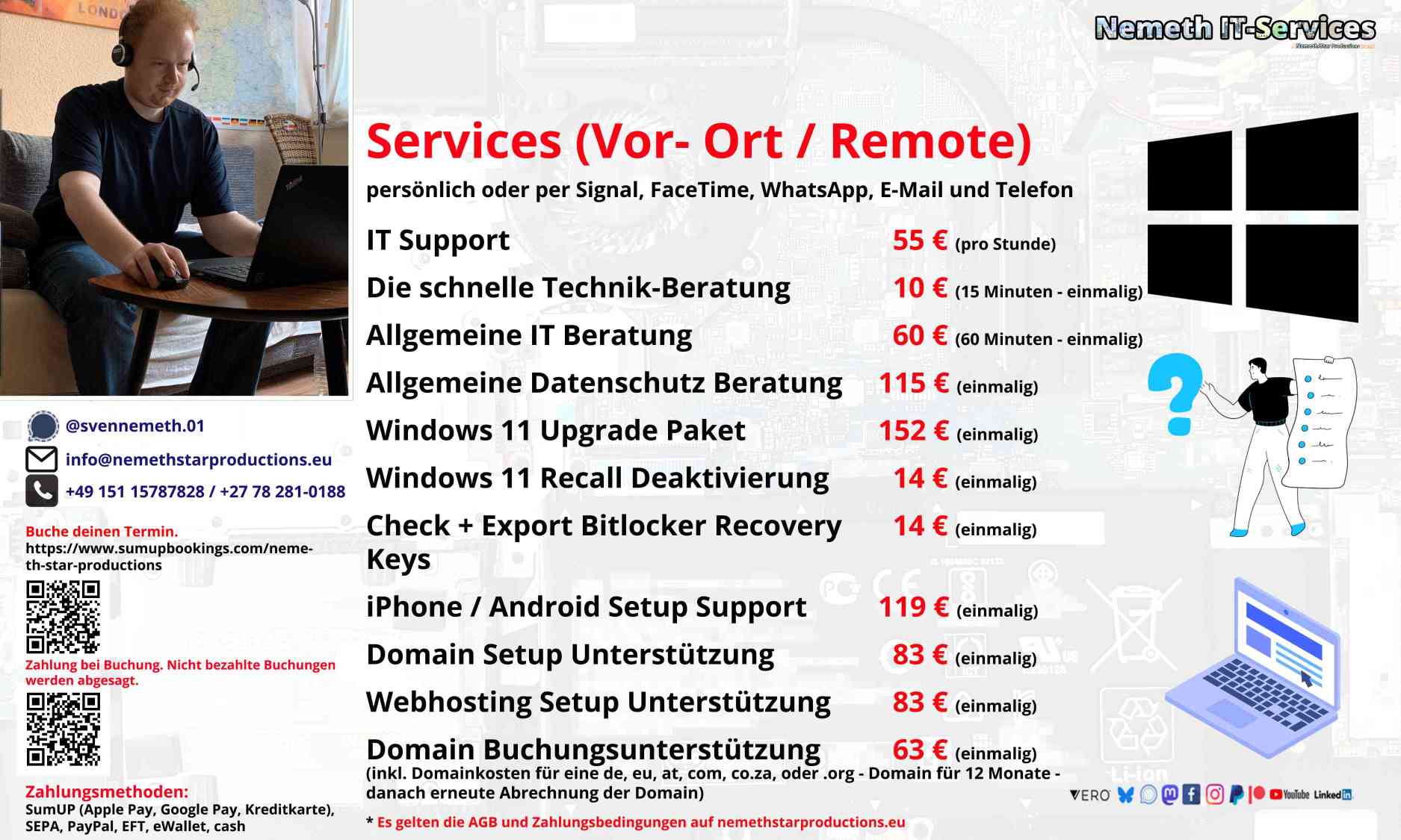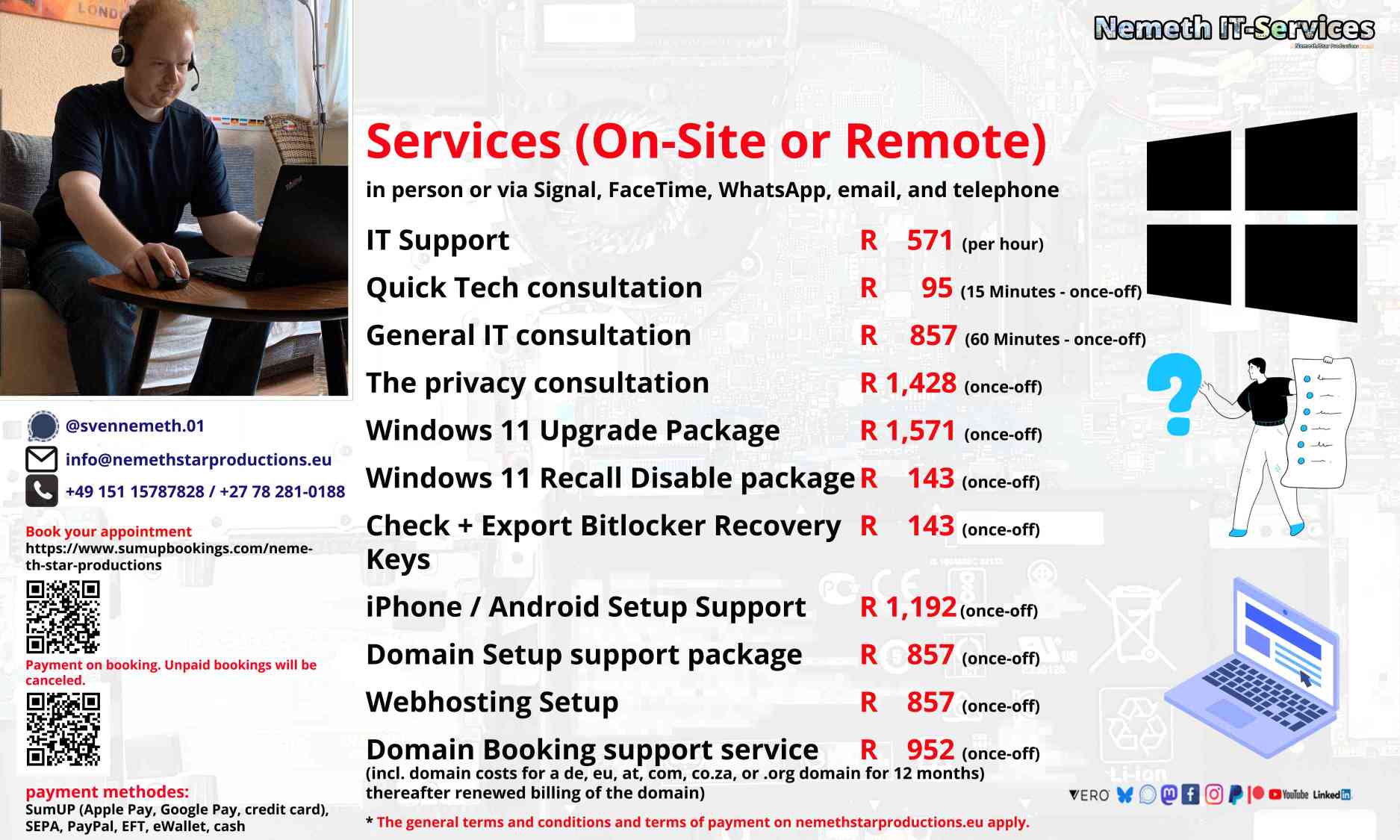 IT Support TutorialsServices Packages, Storys & PodcastOnline ShopOnline Booking (SumUp) Booking via Email Signal Group (Germany/EU) WhatsApp Group (South Africa)