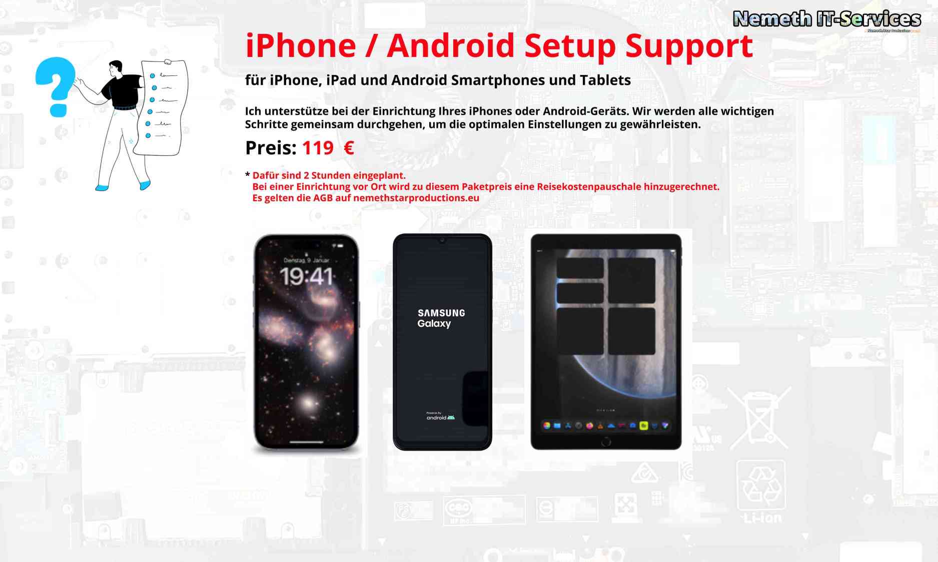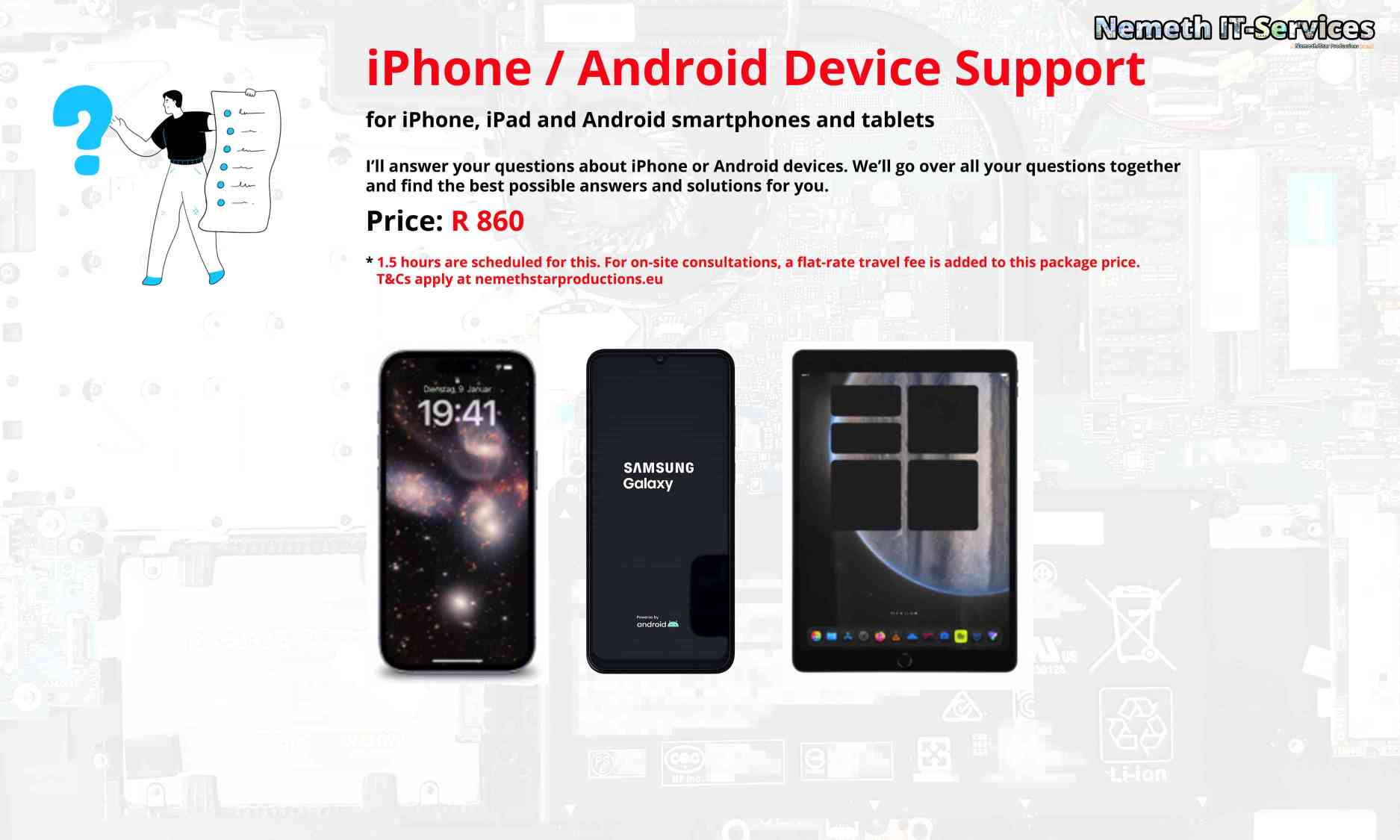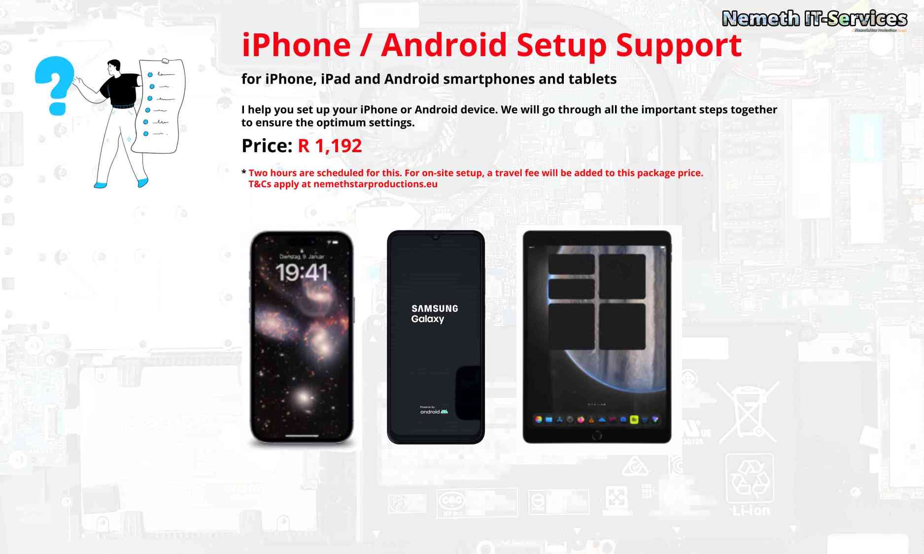 | iPhone / Android Setup Support package | €119 / R 1,192 | Book | Book | + travel costs |
