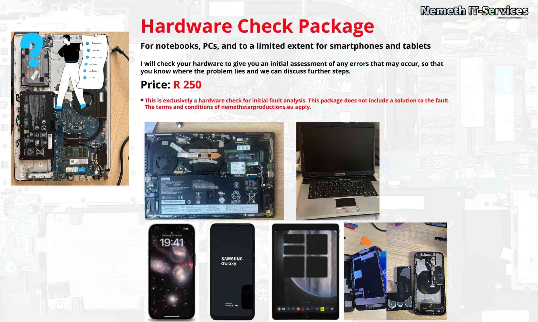 | Quick Tech consultation (max. 15 Min for Tech questions) | €10 / R 95 | Book | Book | + travel costs |