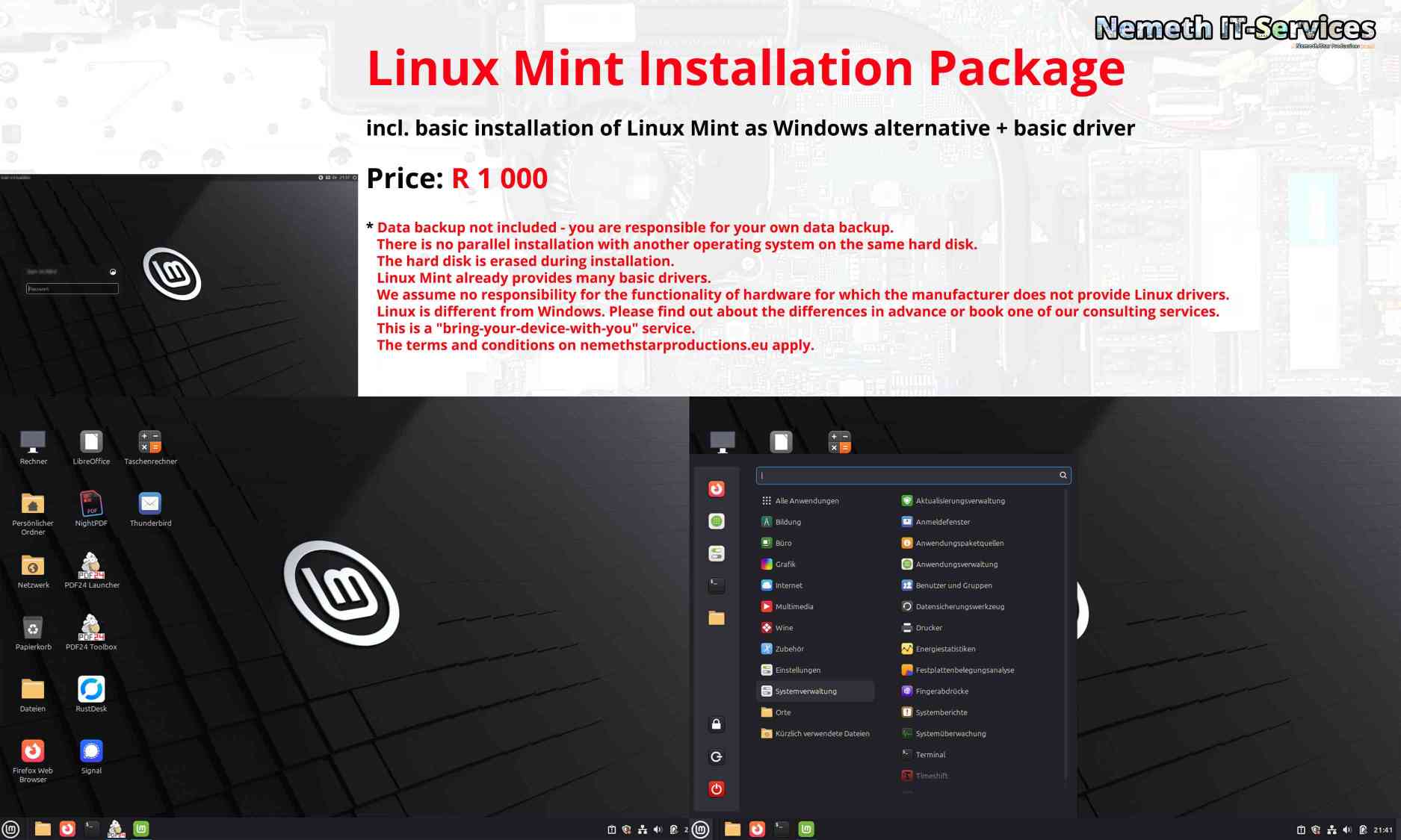 | Linux Mint Basic Installation | €97 / R 1,000 | Book | Book | + travel costs |