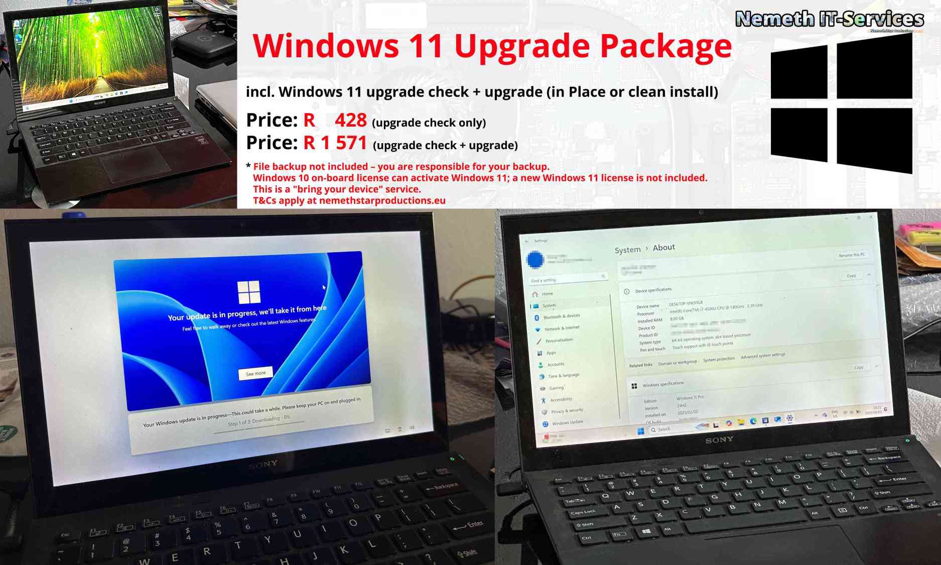 | Windows 11 Upgrade Package | €152 / R 1,571 | Book | Book | + travel costs |